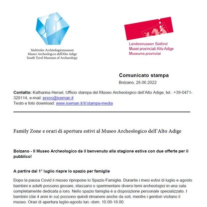 Per venire incontro alla domanda del pubblico internazionale anche a fine estate, sarà prolungato il periodo di apertura estiva: Dall’inizio di luglio fino alla fine di settembre il Museo Archeologico dell’Alto Adige sarà aperto ogni giorno per 3 mesi, compresi i lunedì e i giorni festivi.